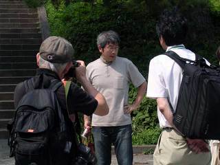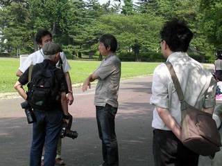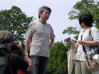 ここは仙台市宮城野区の榴ヶ岡公園。この炎天下になにやら取材を受けているらしいいがらし先生を発見したでござる!