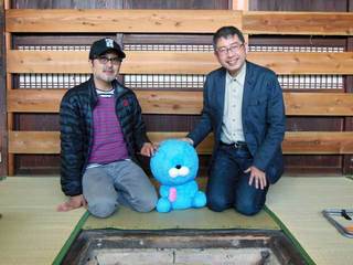 いがらし大使とぼのちゃん、早速現場へ!主人公タケの家の中で、松尾監督と記念撮影でございます!