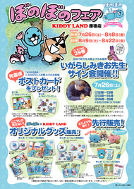 春に大好評いただいた「ぼのぼのフェア&サイン会」が、また開催されることにな~り~ま~し~た~っ!今度はなんとなんと「キデイランド原宿店さん」と「キデイランド大阪梅田店さん」に、いがらし大使が伺います!そして心をこめて、サインを書いて書いて書きまくります!東京の皆様、大阪の皆様、ぼのちゃんといがらし大使に会いに来てね~!