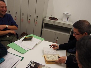 ■控室にて。畠山氏は昔からの熱狂的いがらしファンであり、持参の「さばおり劇場」単行本にサインをしてもらうという、長年の悲願がついに達成されました!